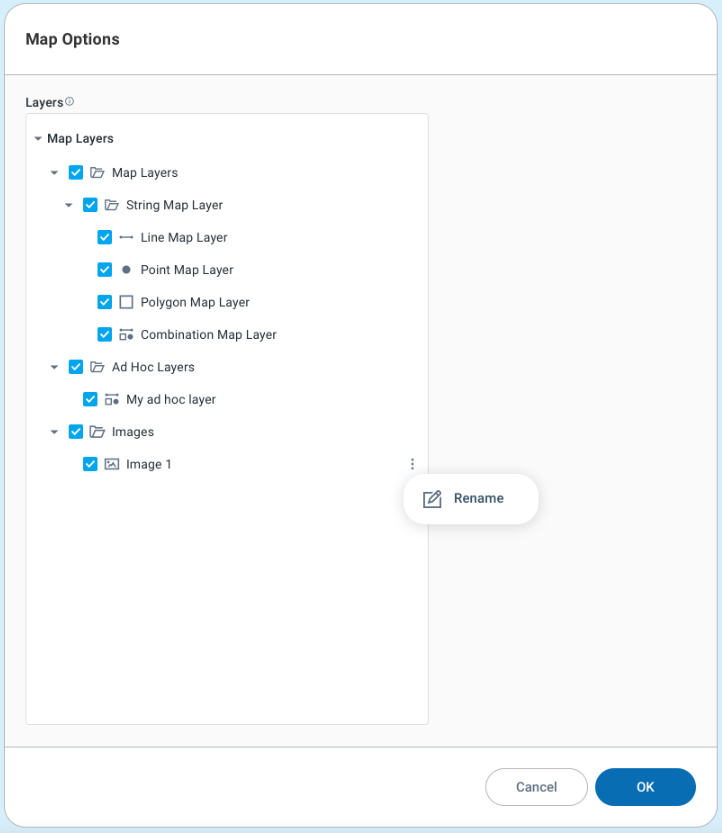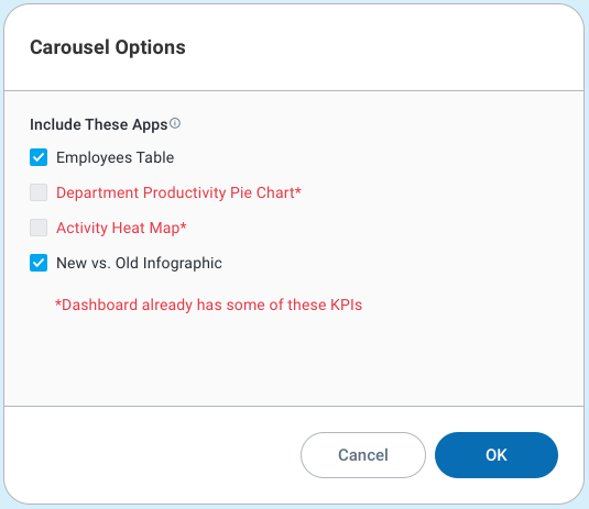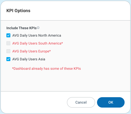 During the Add App to Dashboard task, some Apps may feature a Customize button allowing the user to select which data KPIs, Data Series, or Layers (from Map App) to be added to a Dashboard. In those cases, an extra dialog will be shown from which the user can select from the additional options.