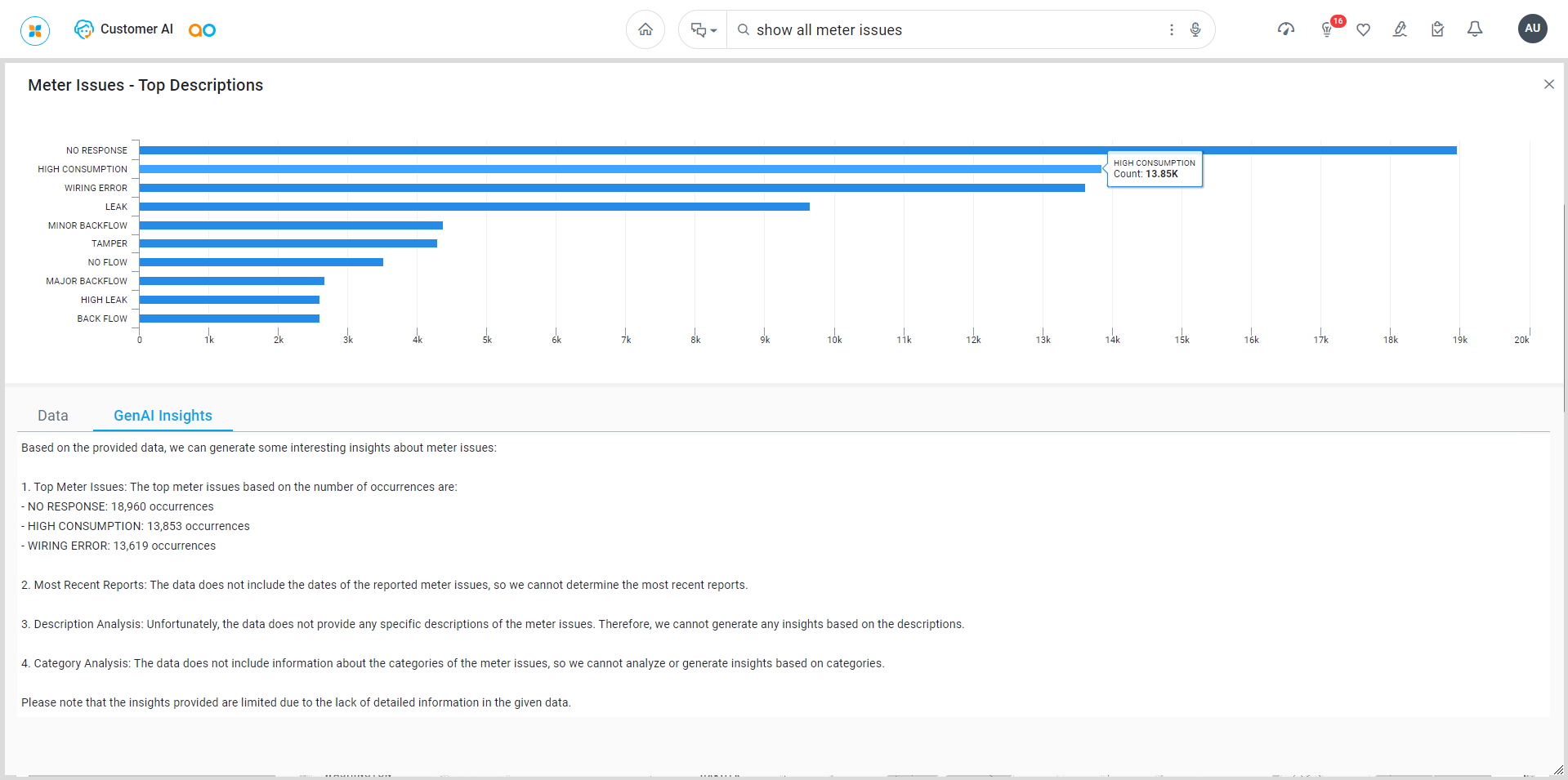 Insights (GenAI) - click the lightbulb icons (where available) to see an AI-generated description of what the visualization of a given component shows. This functionality may take time to generate. See Adding Data Summaries.