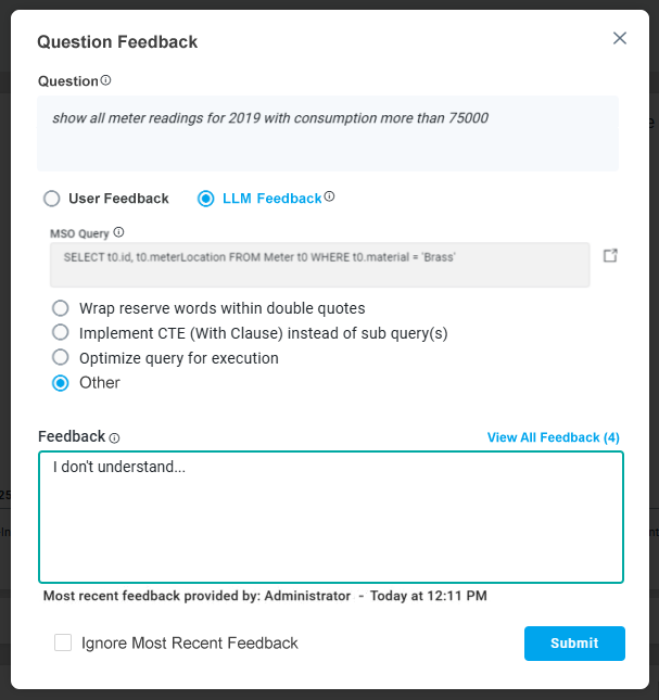 Thumbs Down - opens a dialog where the user can provide some input as to why the thumbs-down icon was clicked. Provide as much information as possible. When clicking the Submit button, the Feedback will be sent for approval (or rejection) by a “supervisor” user with additional permissions to update the Ontology to benefit future users asking the same or similar questions.