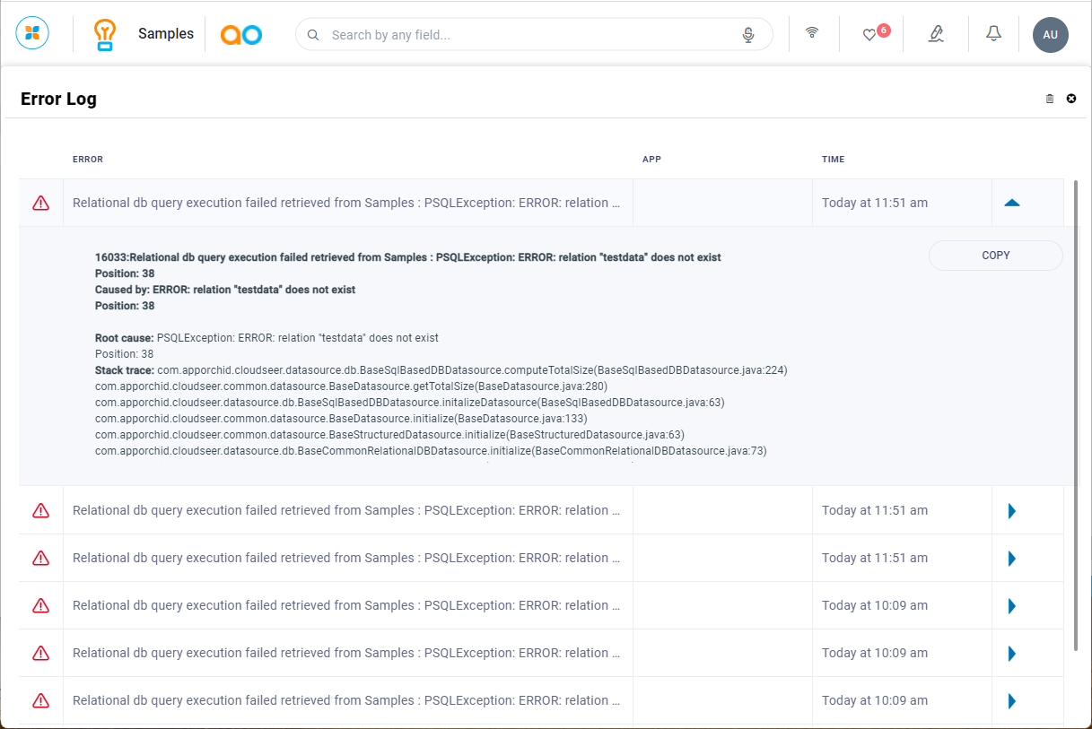 If errors have been encountered during loading of a page in the browser, a count of the errors (in red) will be shown in the User menu. Click the red text to see the Error Log and, if permanent, send this information to the AO Platform Administrator.